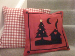 Here’s my first project completed for Christmas – a felt silhouette cushion with hidden pockets for chocolate in the back!