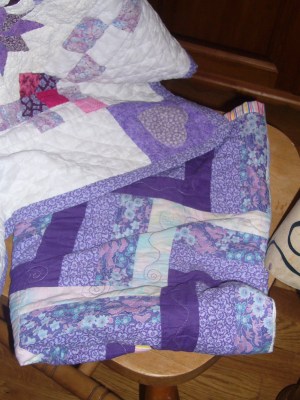 Here’s one I made REALLY earlier. Recently we went to visit friends who we hadn’t seen for a long time. My friend showed me the quilts I had made for her two daughters – still being used and loved every day. I never took a picture of them new so grabbed my camera to capture them 2nd time around. Here’s my first ever quilt – made up in my head with paper piecing because that’s all I knew. A lot of emotion went into that quilt because my mum (a mega quilter) had recently died and I was determined to carry on her rule that every baby should have a quilt. So I thought of her with every stitch.