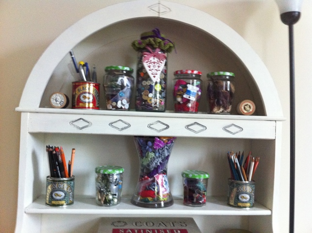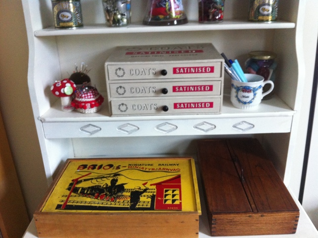 The yellow vintage Brio box is 50 years old and was my brother’s. Im storing UFOs in it The big knitting needle jar is a very 70’s vase from my childhood. I’ve got my thread drawers on show but also stuffed full of my sewing equipment. The smaller Coats drawers now house my circular needles and crochet hooks. And all my buttons, ribbon and floss are in the jam jars.