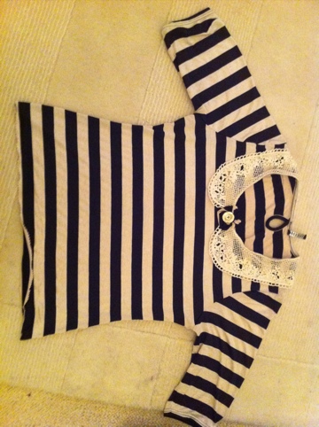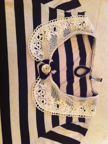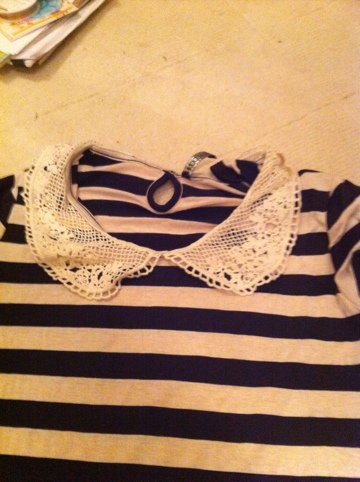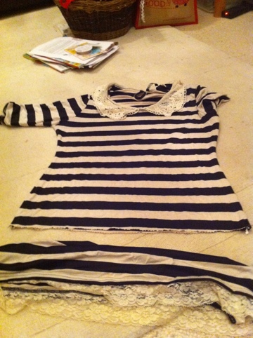 This is a long t shirt from Asos with lace trimming and crochet collar and it looks blardy awful on me. So scissors were the only option.