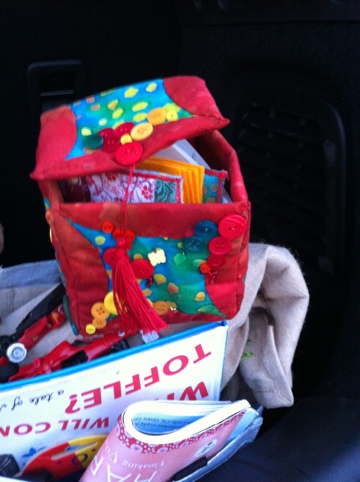 To a cold wet windy railway station carpark at stupid o’clock in the morning…I’m a happy bunny though becasue I’ve just opened mysewingcircle.com sewing swap!! Look! I got the box above and in it a needlecase and pin cushion – look!