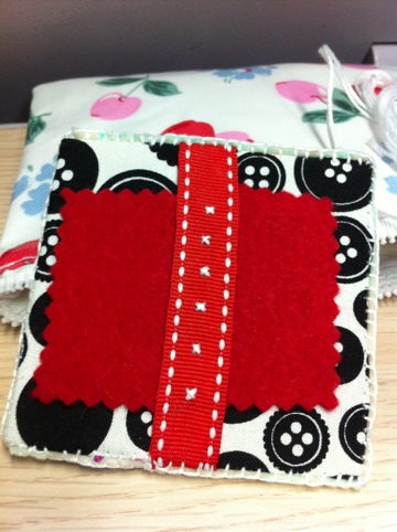 Decide what you want on the inside – here I made a needle holder using ribbon and felt square. Tuck between front and back of the wall as appropriate. Blanket stitch all the way round each wall/floor/roof to secure the lining to the front felt. Yes. really.