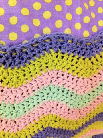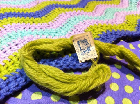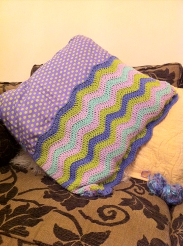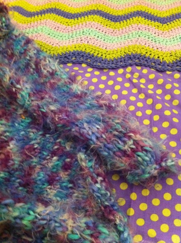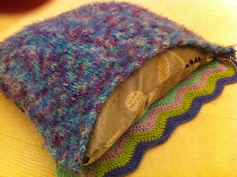 I started with some vintage tapestry wool, some Rowan fabric I had left over from my Thankyou Cushion (on my Here’s one i made earlier page) and a piece of Attic24-inspired crochet I made a couple of years ago. And some hideous fancy yarn knitting I did Years Ago. And the rest is as shown…I’d write more but the photos are far more eloquent.