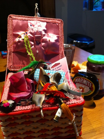 The mark of obsession. Making covered buttons at the breakfast table because I wanted to close my cardigan up! Lovely ribbon from VV Rouloux. Yum!