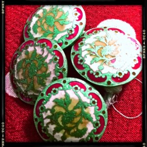 A pincushion made from vintage patchwork hexagons with a nifty little flap to cover the pins up, a vintage tray cloth with embroidery that just needs a little finishing (a project!) and these beeeeooooootiful buttons. I’ve played with the colours on this snap, they’re blue really but I can’t resist a fiddle.