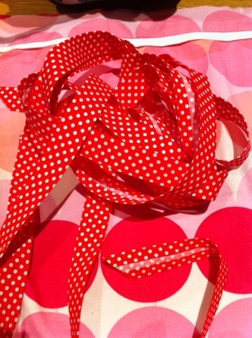 Then you have to bind the waist. I used spotty bias binding I got from the lovely haberdashery I visited on a choose-day. Look.