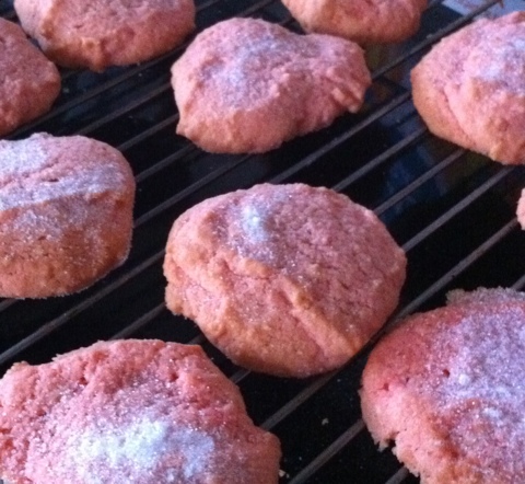 Anyway, I fancied trying a new recipe so I went for the Almond Biscuits but made them pink in a distant homage to the spots appearing on LO, and because pink is happier than plain I find. Here’s the finished articles: