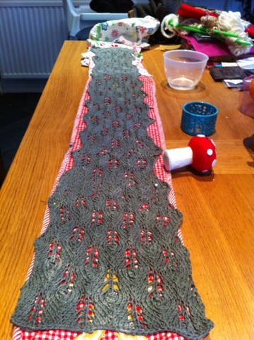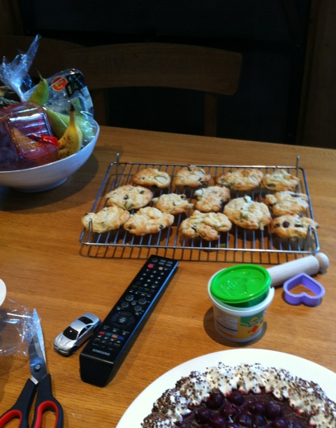 My morning in pictures. Just me and Little One as Elder is off with OH at a Car Thing. We’ve had a lovely time. Tidying (me), shuffling around (both of us) and racing cars (LO). I’ve blocked my fir cone scarf, made some biscuits (honey, pear and raisins), play-doh-ed, sang the ravioli song LOTS and now LO is asleep and I’m having a cup of tea.