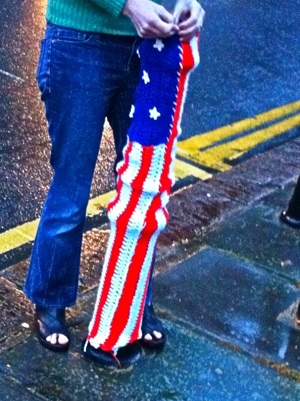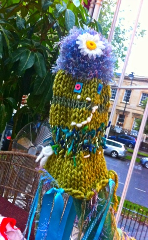 Not the neatest but hey, I did it in about 2 hours! Here’s Dilly’s fruity Pick Your Own masterpiece and Gorgia’s lovely star spangled cozy…plus some more shots of the bombing in situ. We covered the bollards in front of the local Town Hall. I checked this morning, they were still there. Honest citizens in Stitchopolis, eh? For more pictures go to Dilly’s blog here. Her pictures will no doubt be far more adept than my snaps.