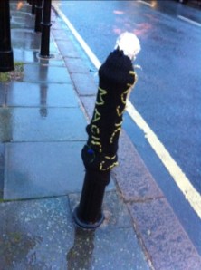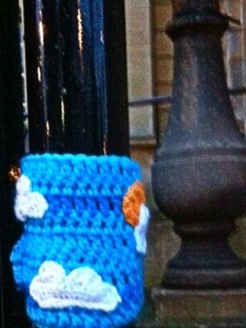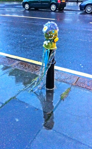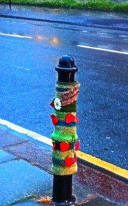 Innocuous, non? Little did you know that these fine examples of rain sodden footwear belong to Stitchopolis’ newest band of renegades. Corralled together by the wonderful Dillytante you are witness to our first joint yarn bombing….soggy, yes but excellent fun and definitely addictive. Want to see what we got up to?