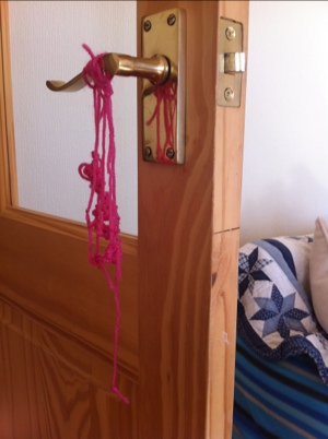 Elder is learning to crochet. He crotchets in bed, at breakfast, in front of the telly. A six year obsessed. I am so happy! This is his free form door handle decoration. Like? !