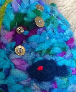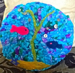 Then I needle felted the fish, seaweed, sand and starfish using a combination of wool roving and felts. I did a bit of embroidery to enhance and might well do some more one day. I used vintage metal buttons to make the bubbles. Remember to sew on very well if small children are likely to be cuddling this cushion.