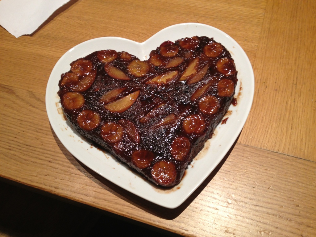 The recipe is very simple, cannibalised from my old faithful the Be-Ro book. Victoria sponge basic mix, enhanced with lebkuchen spices and coriander (thank you Gourmet Gardens). Then you make the butterscotch (2.5 oz butter melted with 2oz soft brown sugar), arrange the fruit slices (plums, bananas and apples today), pour over the sauce and then place to cake mix on top. I added blackberries to the mix to make it purple (!)