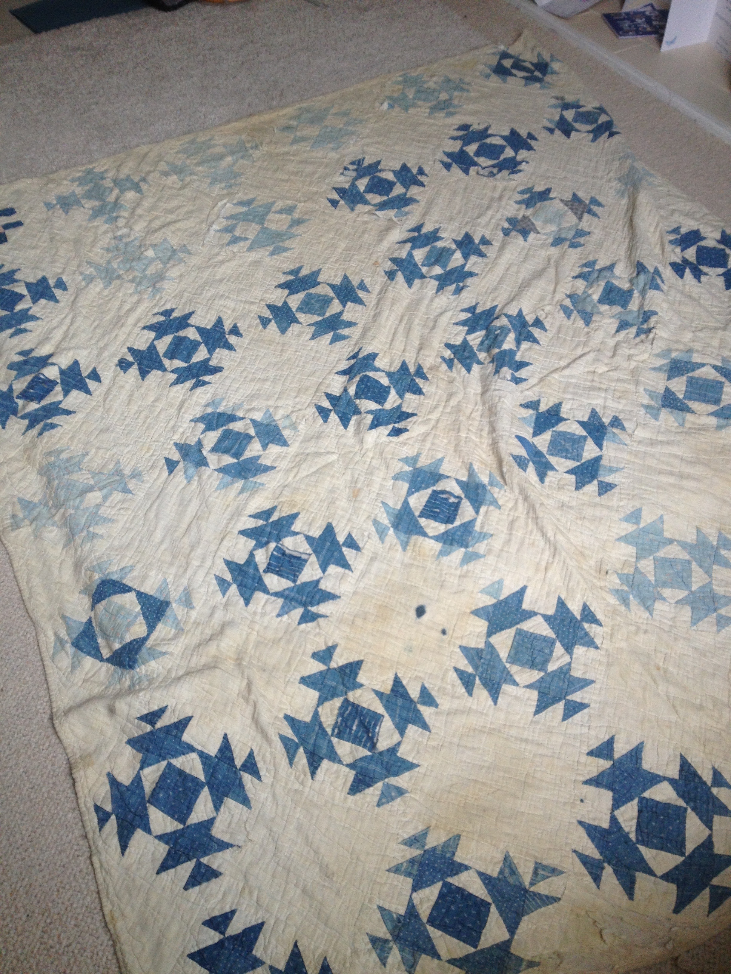 …has far to go. Here’s a well travelled example for a wet and windy Thursday. Completely wrecked but beautiful anyway. It even has an odd Block included because only God can create perfection. Feel the stories this quilt could tell….