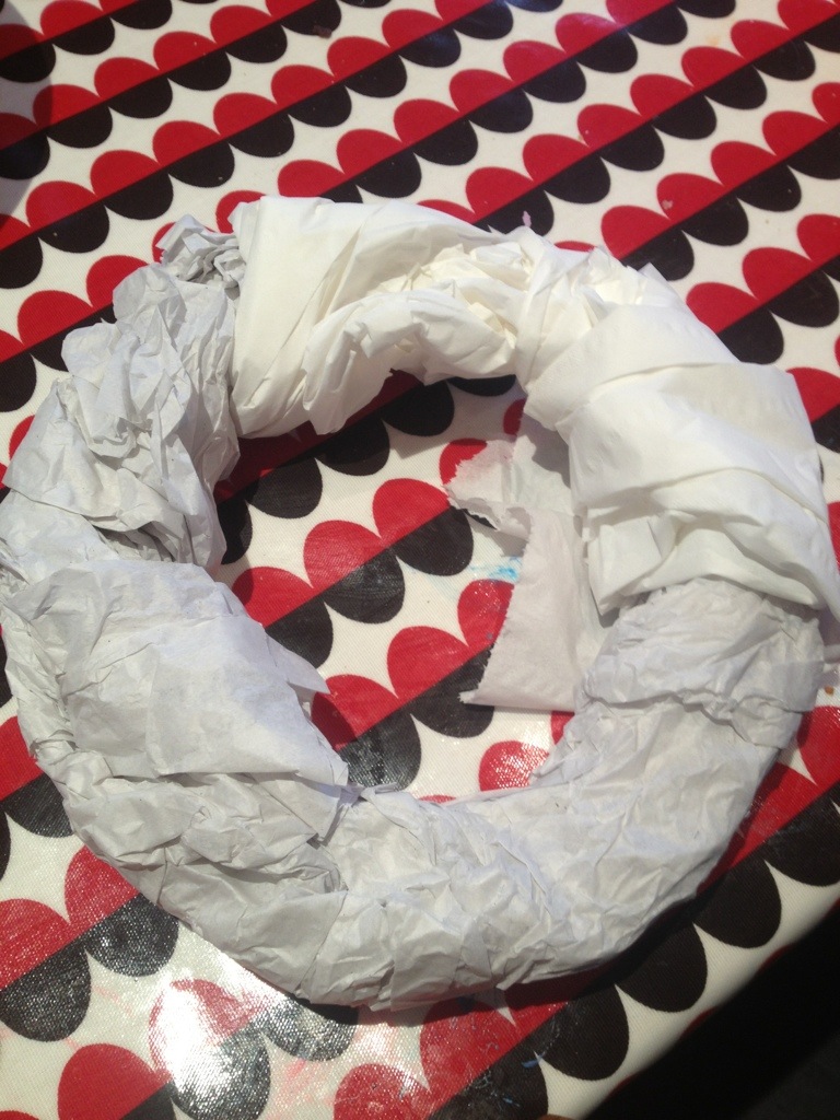 I used a wire wreath form that I bought for pennies on eBay. I then wrapped old tissue paper and ( forgive me) loo roll around it, squished it a bit and Sellotaped it secure.