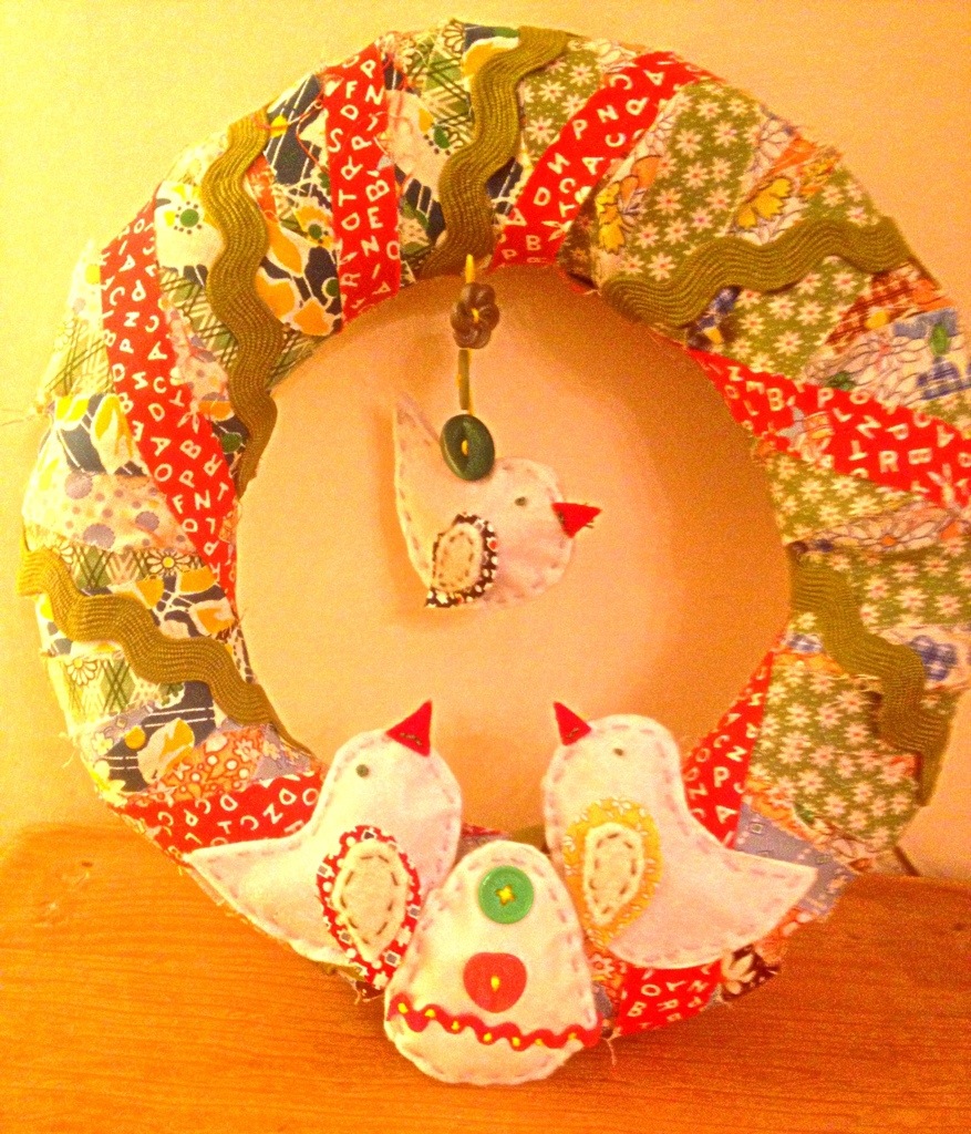 Basically, whatever you want goes. I did a couple of birds and an egg. I slightly stuffed them using paper again and stitched them on.