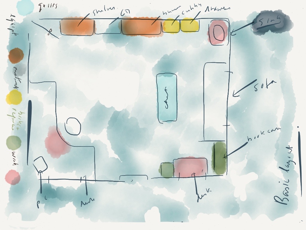 …is a metaphor for my state of mind. Packed with ideas and fun stuff but disorganised and a mess. The sketch above is my broad tidying plan. My stash is so bad now that I will be disposing of lots soon. Those lucky charity shops!