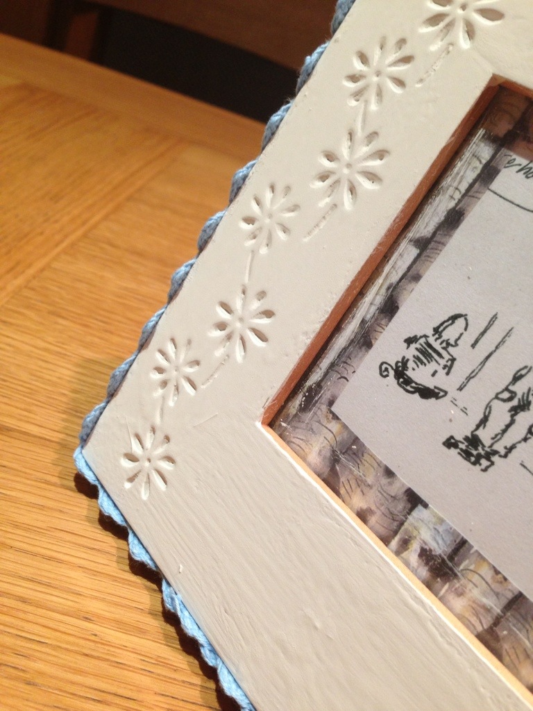 A quick project…. Plain wood frame from the charidee spruced up with fabulous Annie Sloan Chalk Paint and blue lace washi tape round the outside edge. The little sketch was too small so I made an inner frame from some craft paper to hide the edges. Voila!!!