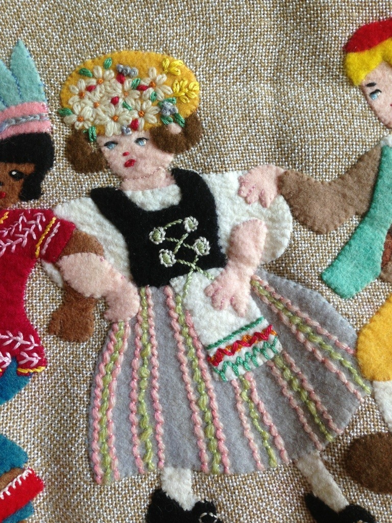 Have to share this find…hand stitched felt children! I spotted them in a charity shop (rhymes with Boo High-der). They were on a manky antimacassars which I chopped off pronto. I auditioned backgrounds and went for some beautiful wool I got a few years ago, pre Portas charity shopping. I’m trying reverse appliqué but its a journey, lets say…any tips would be helpful!