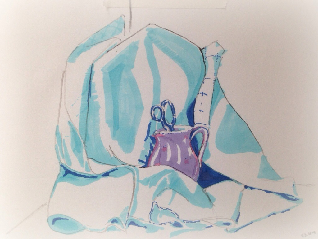 I love my studio. I love it. An oasis of calm. An escape. A room of my own, sort of. I’m using one arrangement and trying out various media to remind myself of how they ‘feel’. Yesterday I used marker pens, a first for me. Previously I used pencil and charcoal. Next up will probably be acrylic, new for me. Loving this all. Life is good today. I hope yours is too.