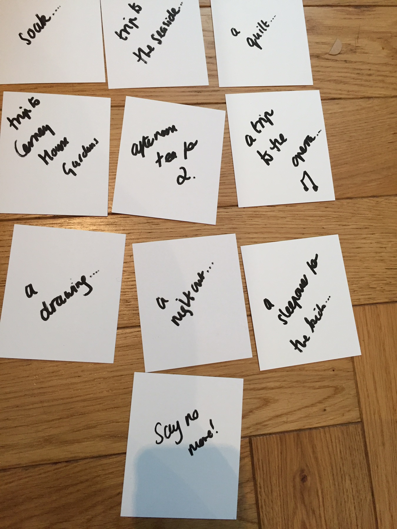 Each card is a gift. None of them expensive big flowery gifts, more personal experiences that I know my friend will enjoy. So for example, a trip to a local garden, a trip to the seaside, afternoon tea… You see the type of thing…